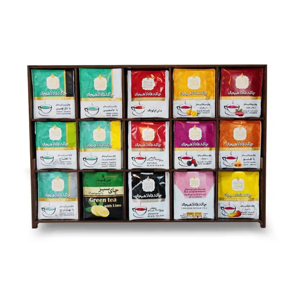چای سیاه کیسه ای 15 طعم 75 عددی جعبه چوبی برند رفاه لاهیجان